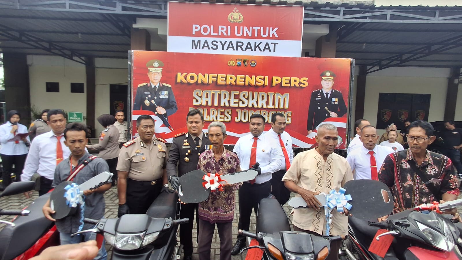 Caption: Kapolres Jombang didampingi KasatReskrim saat menyerahkan motor korban curanmor usai gelar pers release